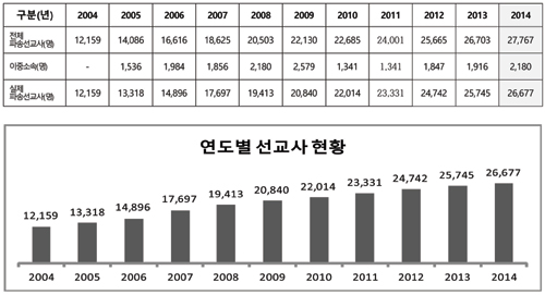 (사)한국세계선교협의회가 8일 발표한 통계에 따르면, 2014년 12월 말 현재 한국 선교사는 총 170개국에 26,677명(이중소속 선교사 수의 절반 제외) 파송된 것으로 나타났다. 전체적으로 꾸준히 늘어나고 있지만, 전년도 대비 1,003명…