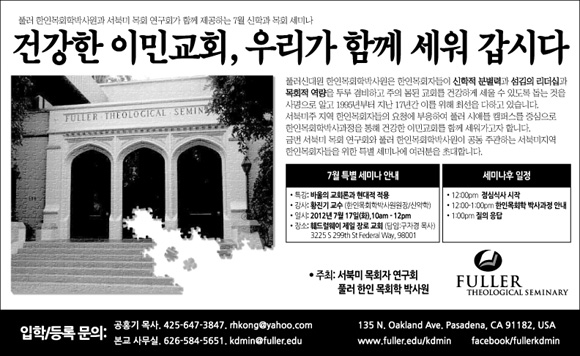 복음주의 신학의 명문으로 꼽히는 풀러 신학대학원 한인목회학박사원에서는 오는 7월 17일(화, 시애틀 세미나), 18일(화 밴쿠버 세미나) 양일에 걸처 서북미 한인 목회자들을 위한 특별 세미나를 개최한다.