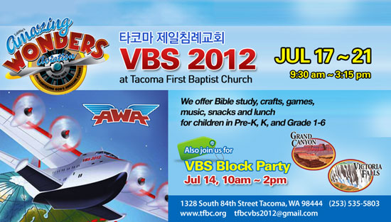 타코마 제일침례교회 '여름성경학교(Vacation Bible School 이하 VBS) 가 오는 7월 17일(화) 부터 21일(토)까지 매일 오전 9시 30분 부터 오후 3시 30분까지 진행된다. 브래드 피트 엄마, 반동성애 발언으로 살해 위협까지