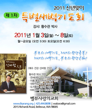 벨뷰사랑의교회는 신바람 박사 황수관 교수를 초청해 1월 3일(월)부터 8일(토)까지 2011년 신년 맞이 특별새벽기도회를 개최한다. ‘부모의 새벽기도, 자녀의 평생축복! 자녀의 새벽기도, 부모의 평생은혜!’라는 주제로 열리는 …