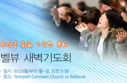 오는 9월 13일(월)부터 형제교회 벨뷰지역 새벽기도회가 시작된다. 장소는 뉴포트 하이스쿨 인근의 뉴포트 커브넌트 교회이며, 예배시간은 오전 5시 30분이다. 새벽기도회는 월요일부터 금요일까지 진행되며 토요일은 바델의 본 …