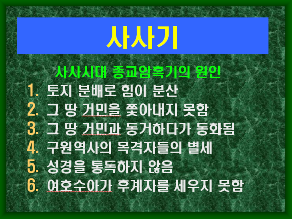 사사기란 말은 히브리어 '쇼페팀'인데 그 뜻은 '재판하는 사람들'이란 것입니다. 사사기를 차라리 '판사들의 기록'이라고 했으면 쉽게 이해했을 것입니다. 사사시대의 정치 체제는 신정(神政) 통치 시대로 신주주의(Theocracy)라고 …