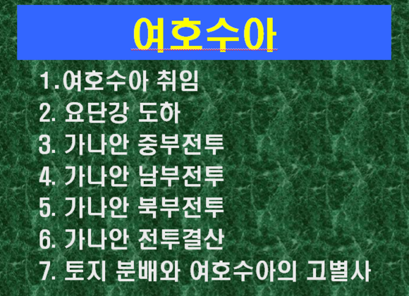 모세가 죽은 후 지도자 2세로 여호수아가 등극한 이야기, 요단강 도하 이야기, 여호수아가 싯딤에서 정탐꾼을 여리고 성으로 파송하는 이야기가 등장합니다