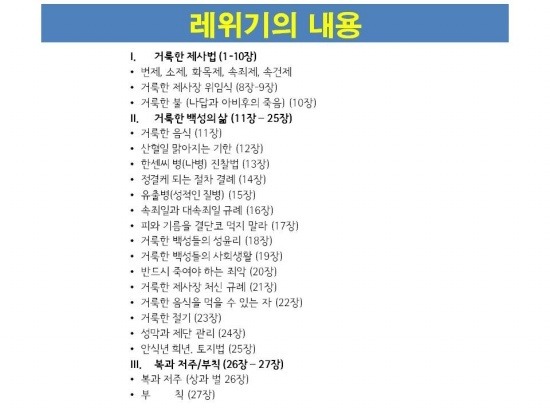 레위기로 들어갑니다. 레위기는 성도들은 말할 것도 없고, 목사들도 흥미도 없고 관심도 없는 책입니다. 그러나 레위기를 제쳐 두면 구약을 포기하는 것과 같습니다. 레위기는 구약의 핵심이며 모세오경의 중심이기 때문입니다